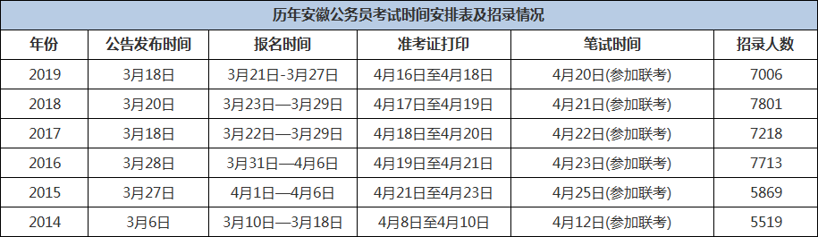 由上表可見(jiàn),安徽公務(wù)員考試時(shí)間比較穩(wěn)定,每年3月中下旬左右出公告和報(bào)名,筆試時(shí)間4月中下旬,且近幾年都參加聯(lián)考,所以安徽繼續(xù)參加2020年聯(lián)考的幾率非常大,如果今年繼續(xù)參加(具體時(shí)間安排以2020年安徽公務(wù)員公告為準(zhǔn))。