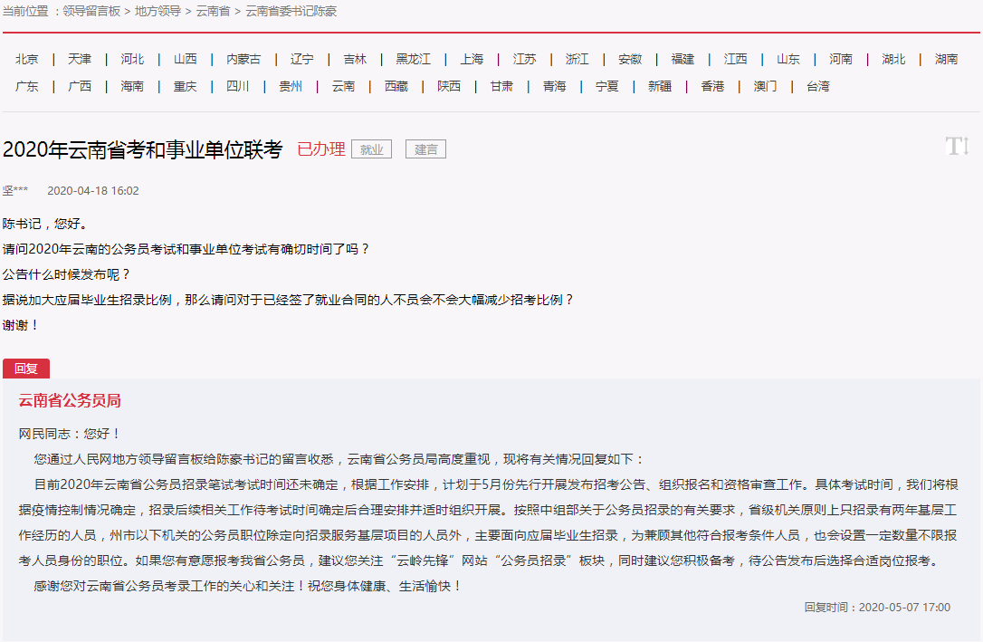 受疫情影響,2020年各類考試都推遲進行,在就業(yè)嚴峻的情況下,眾多考生非常關(guān)注2020云南省考何時開始。近日,在“人民網(wǎng)領導留言板”欄目中云南省公務員局就何時開展2020省考進行了答復,具體內(nèi)容如下: