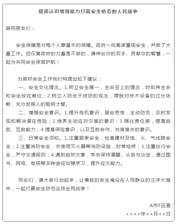 結(jié)語:這個(gè)段落主要起號(hào)召作用。當(dāng)交代完所要宣傳的內(nèi)容以后,就要號(hào)召宣傳對(duì)象來落實(shí)踐行所宣傳的內(nèi)容,這樣的話,宣傳稿才算完整。
