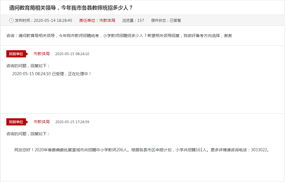 在5月14日,有網(wǎng)友在宣城市教育體育局互動交流平臺提問:請問教育局相關(guān)領(lǐng)導,今年我市教師招聘統(tǒng)考,小學教師招聘招多少人?宣城市教體局也是給出了如下回復:2020年省委編委批復宣城市共招聘中小學教師206人。根據(jù)各縣市區(qū)申報計劃,小學共招聘161人。