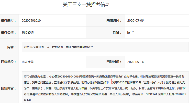 另外,2020年蕪湖市三支一扶計(jì)劃招50人(以下內(nèi)容及截圖來源于蕪湖市人民政府):