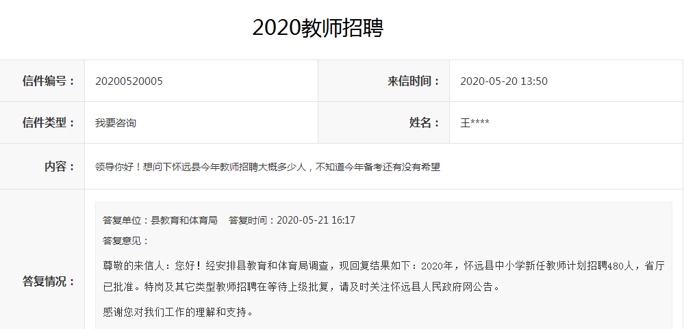 尊敬的來(lái)信人:您好!經(jīng)安排縣教育和體育局調(diào)查,現(xiàn)回復(fù)結(jié)果如下:2020年,懷遠(yuǎn)縣中小學(xué)新任教師計(jì)劃招聘480人,省廳已批準(zhǔn)。特崗及其它類(lèi)型教師招聘在等待上級(jí)批復(fù),請(qǐng)及時(shí)關(guān)注懷遠(yuǎn)縣人民政府網(wǎng)公告。
