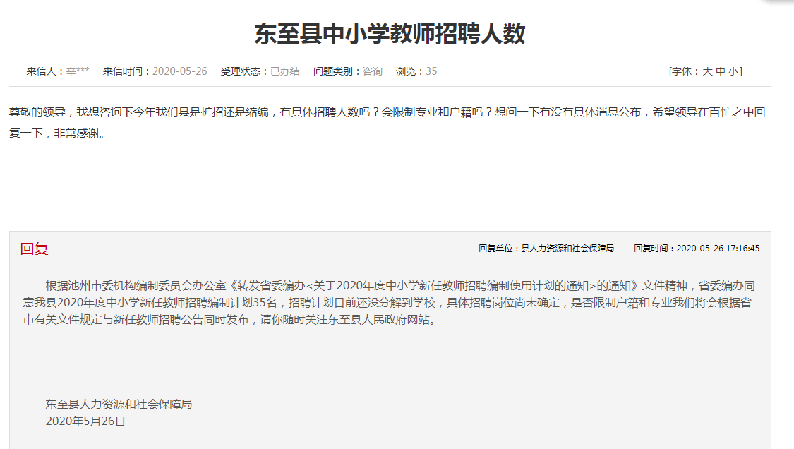 縣人力資源和社會(huì)保障局回復(fù)根據(jù)池州市委機(jī)構(gòu)編制委員會(huì)辦公室《轉(zhuǎn)發(fā)省委編辦<關(guān)于2020年度中小學(xué)新任教師招聘編制使用計(jì)劃的通知>的通知》文件精神,省委編辦同意我縣2020年度中小學(xué)新任教師招聘編制計(jì)劃35名,招聘計(jì)劃目前還沒(méi)分解到學(xué)校,具體招聘崗位尚未確定,是否限制戶(hù)籍和專(zhuān)業(yè)我們將會(huì)根據(jù)省市有關(guān)文件規(guī)定與新任教師招聘公告同時(shí)發(fā)布,請(qǐng)你隨時(shí)關(guān)注東至縣人民政府網(wǎng)站。