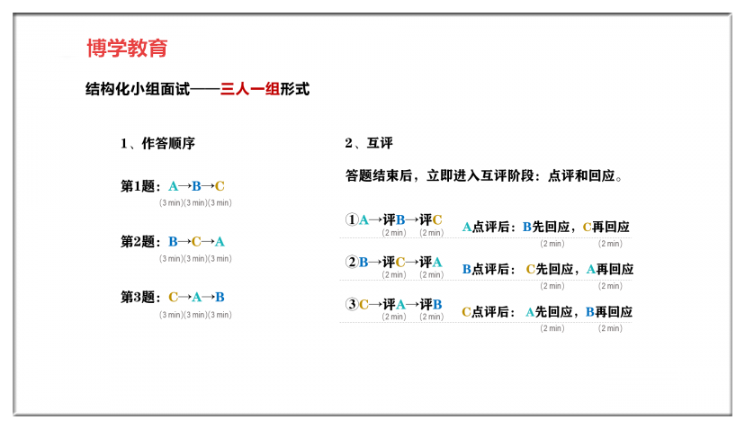 (1)結構化小組互評:15分鐘場外備考看題,進入考場后,按要求每人依次答題,每道題目3分鐘(注:個人答題時間:2020年—2021年均為3分鐘,2018年—2019年均為2分鐘);全部答題結束,按要求展開互評,點評每人的時間為2分鐘;被點評人針對點評展開回應,時間2分鐘。