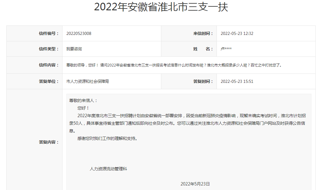 領(lǐng)導(dǎo),您好!請問2022年安徽省淮北市三支一扶報名考試信息什么時間發(fā)布呢?淮北市大概招錄多少人呢?百忙之中打擾您了。