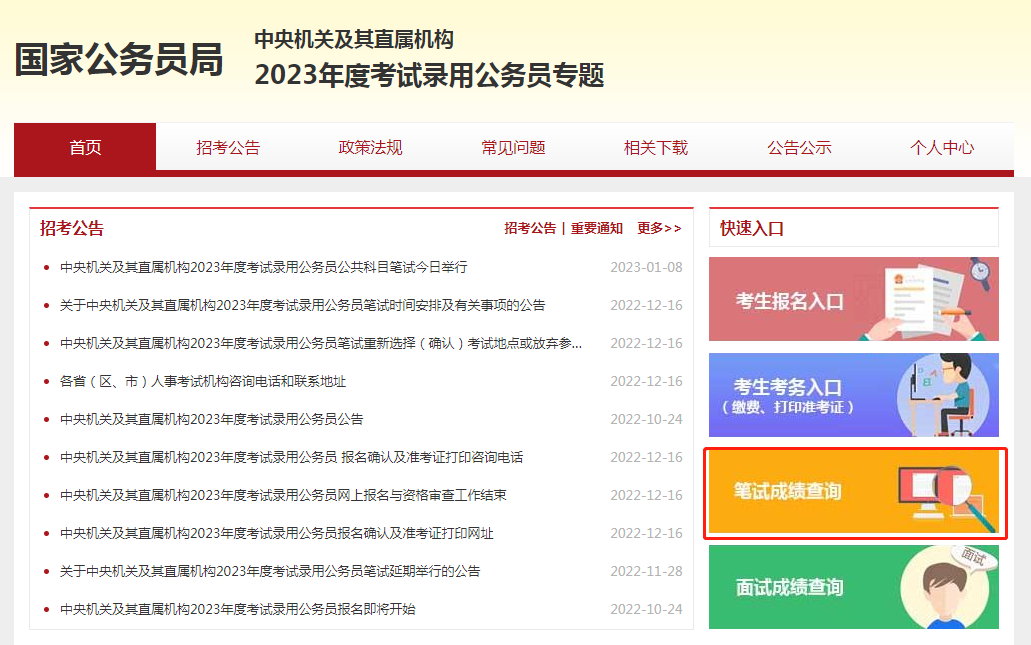 國考成績發(fā)布后,考生通過中央機關及其直屬機構2023年度考試錄用公務員專題網(wǎng)站,進入“筆試成績查詢”網(wǎng)頁即可查成績,進面名單可能會在查成績的同一天發(fā)布,也有可能會延遲一兩天發(fā)布。