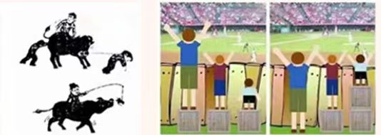 右邊漫畫:左邊是三個(gè)人(從左到右身高依次遞減),踩著同樣的方箱趴在墻外看足球場上人踢足球。右邊是同樣場景,但是三個(gè)不同身高的人下面踩的方箱依次遞增。對此,你想到了什么?